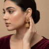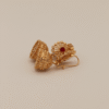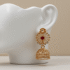 This exquisite gold-toned jhumka earring features intricate filigree craftsmanship, centered with a vibrant red stone and sparkling clear accents. The traditional bell-shaped design adds a touch of elegance, making it a perfect accessory for festive or special occasions.