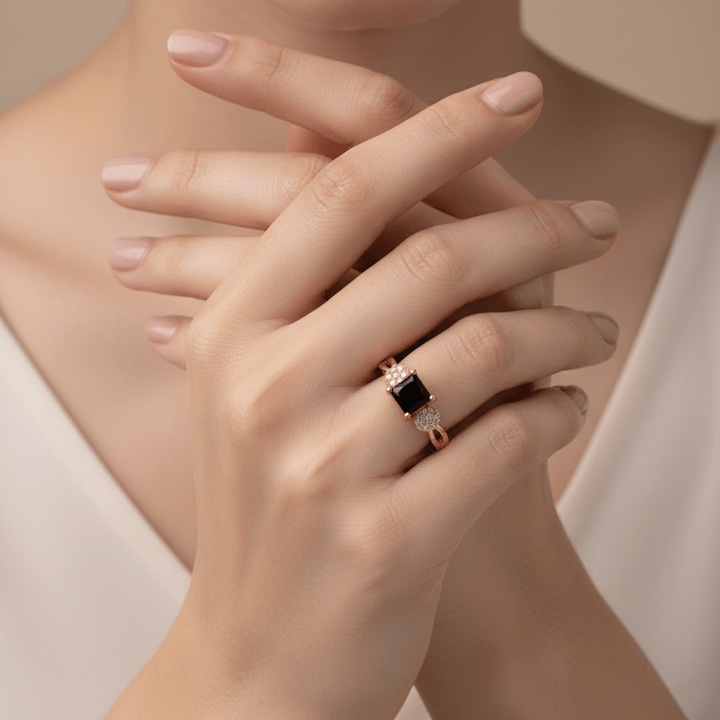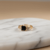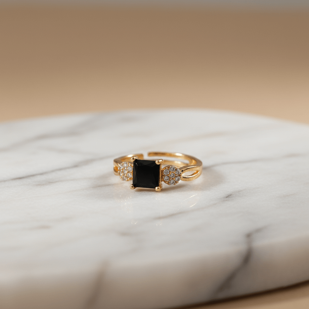 This elegant ring features a brilliant, square-cut simulated stone flanked by clusters of sparkling crystals. The gold-toned, adjustable band offers a comfortable and custom fit, making it a versatile accessory to complement any look.