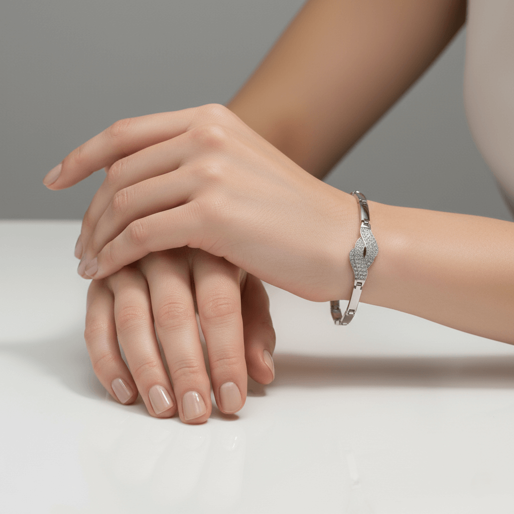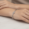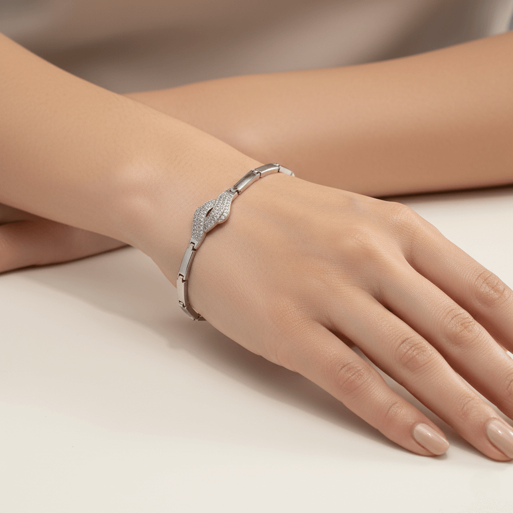 This stylish silver-toned bracelet showcases a sleek curved centerpiece with a textured finish that adds subtle sparkle. Crafted with a smooth linked band and secure clasp, it offers a modern, polished look, perfect for everyday wear or special occasions.