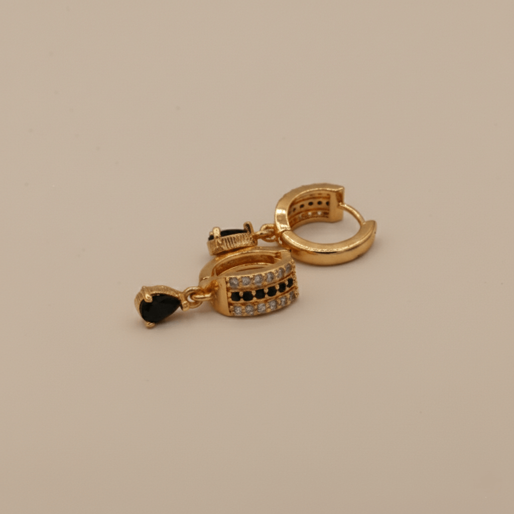 These elegant earrings feature a sleek rectangular stud adorned with shimmering stones, paired with a delicate pear-shaped drop that sways gracefully with every movement. The refined design blends modern geometry with a hint of classic charm, making it perfect for both festive and evening wear. A versatile statement piece that adds sparkle, color, and sophistication to any look.